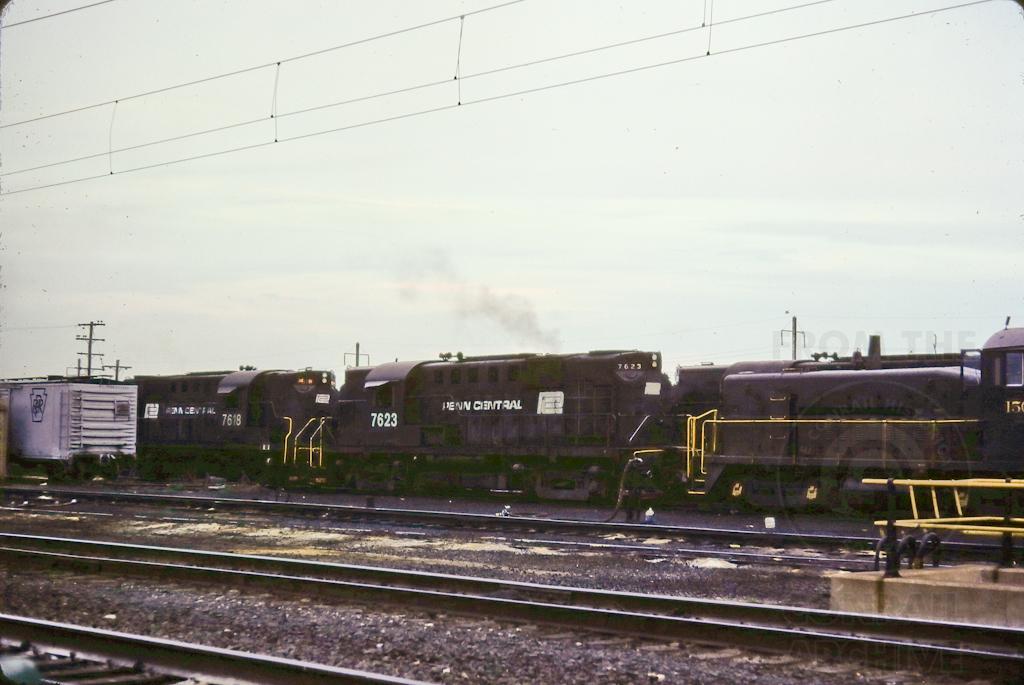 Former RDG SW900 1508 (CR 8708) lines up with PC RS11's 7623 and 7618 at Morrisville in April, 1977, while a white PRR 40' boxcar rests on a foreground track.