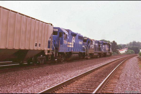 CR 7635 was perhaps the rarest locomotive on the CR roster. The 7635 was an experiment, using the body of a GP35 and rebuilt into a GP38. The unit would frequent the Conway area and on 9/19/1994 it was being used in a helper set on the Fort Wayne Line to the West of Conway. The 7635 & 8230 are shoving hard on the rear of PIPR at Homewood, PA.