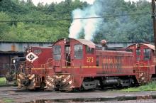 In a typical summer, 1977 scene at the Bethlehem roundhouse, LV RS-11 7643 belches smoke behind an idling LV SW-8 273.