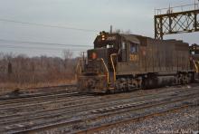 Former PRSL GP-38 2001 leads a quartet of mixed CR power through Abrams yard in early February, 1977.