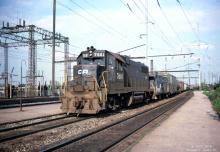 Conrail (ex PRSL) GP38 #7661 is the helper on a westbound (CAPI or CARU) at Frankford Junction in Philadelphia, PA. sometime in 1979