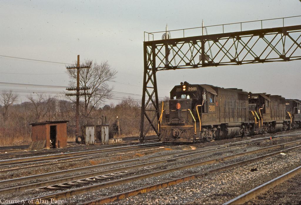 A quartet of mixed CR power, led by PRSL GP-38's 2001 and 2007, rumbles through Abrams yard in February, 1977.