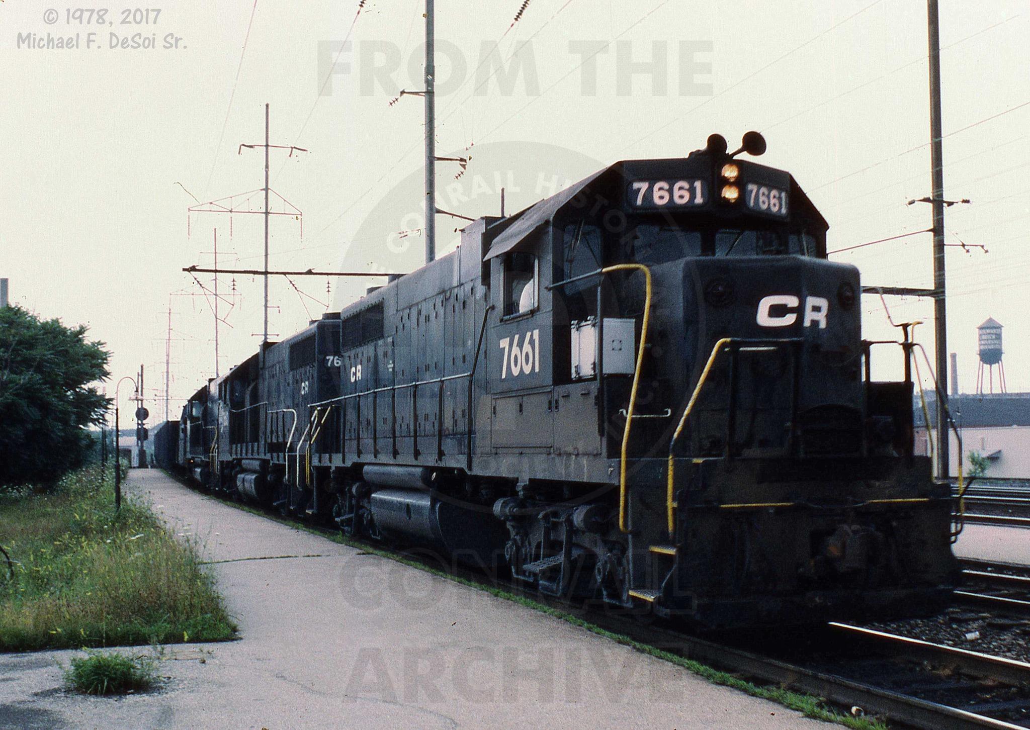 Conrail (ex PRSL) GP-38 #7661 leads an eastbound (Possibly RUCA, PICA or ENCA) through the station at Frankford Junction in Philadelphia, PA. July 1978
