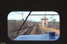 From the cab of Conrail GP38 7662 on WPCA-31, we see Winslow Junction tower on the Amtrak Atlantic City Line on 1/8/1984