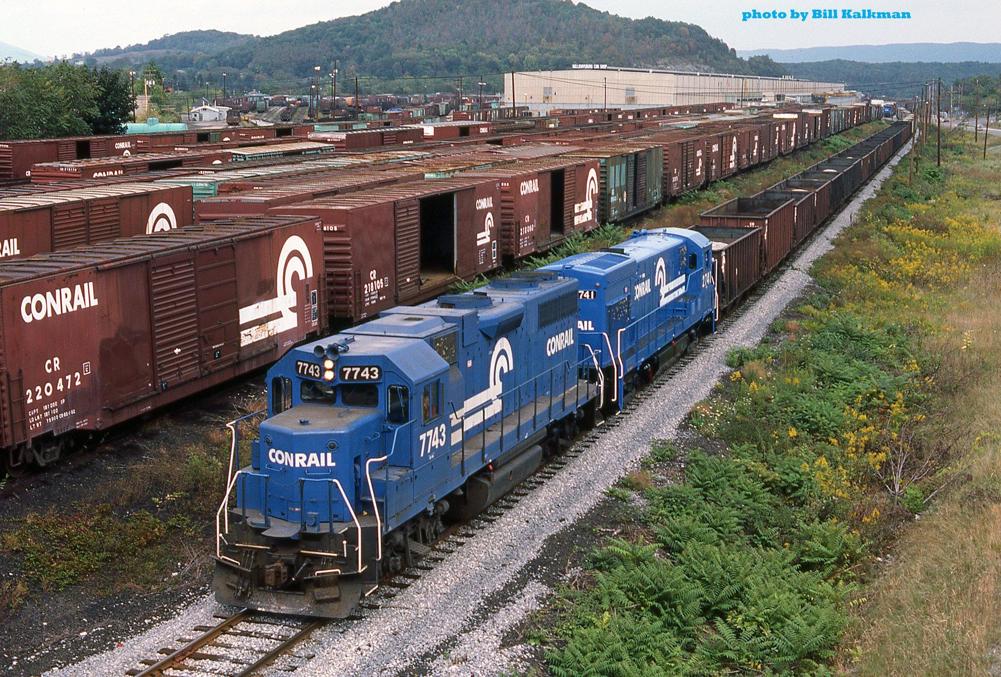 A ballast train is passing the Sam Rea Car Shops. A plethora of Conrail box cars are waiting to be worked on. GP38 7743 & U23B 2741 are leading. 3:30PM on 9-29-84 in Hollidaysburg, PA.