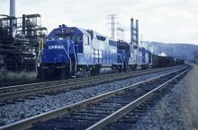 GP38's 7775, 78 and 76 pull a train into the siding at US Steels Clairton Works...