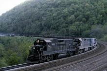 Complete loadedore train is in view as it flies downhill in a cloud of brake smoke, just barely hanging onto being unders control.