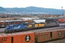 An autorack loaded with new Ford Pinto's on the next track gives historical perspective.
