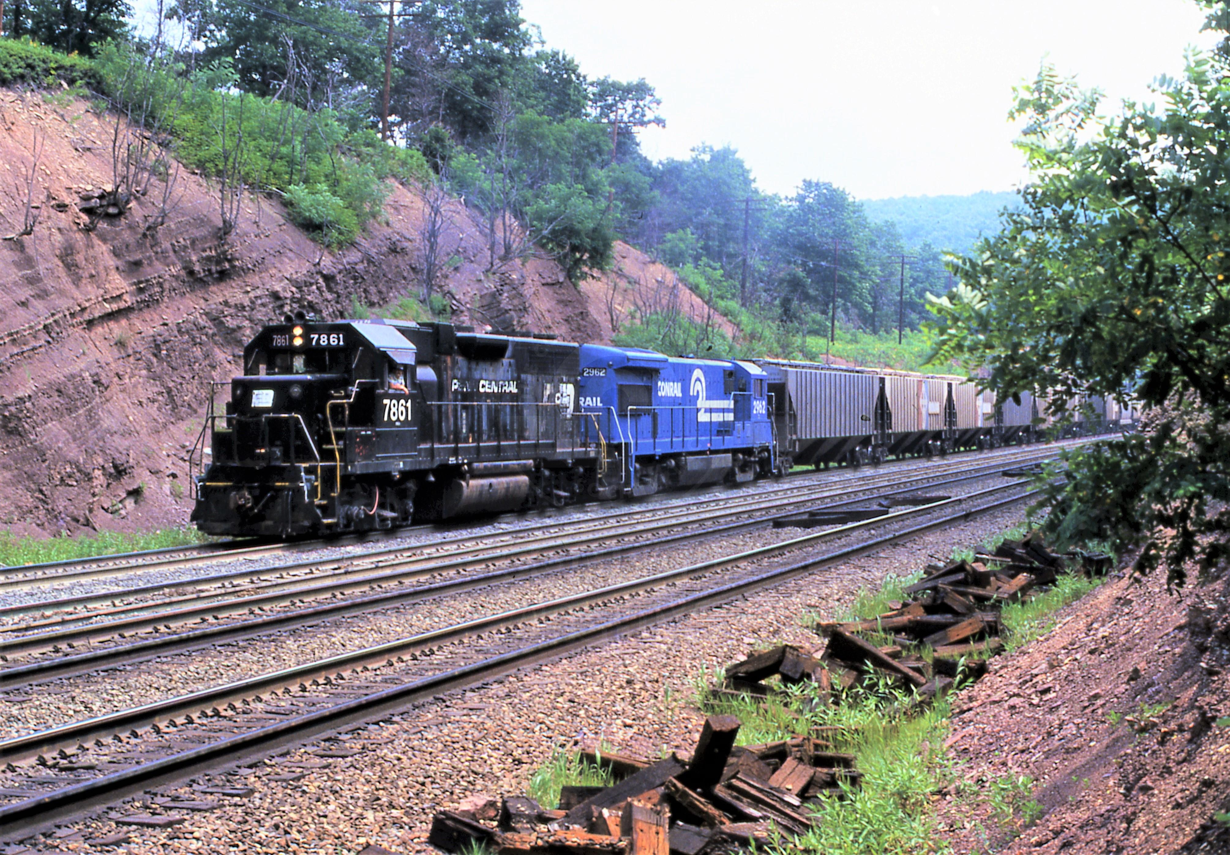 Conrail Ex Penn Central #7861. GE U33-B #2962. Near Gallitzin, PA. August 15, 1978