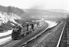 A WB manifest climbs upgrade at Tunnel Hill, PA on 3/19/78 with two GP38s and a SD40-2.