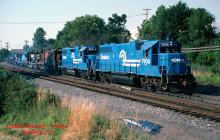 ALEN with 126 cars in July 1989 at Belt Line Jct. heading into Reading yard to work. Non-DB GP38 7906 with built-out cab leading, 8110 has just CR initials on the nose, Tuscan N&W C30-7 8077 and a CR U23C trailing.