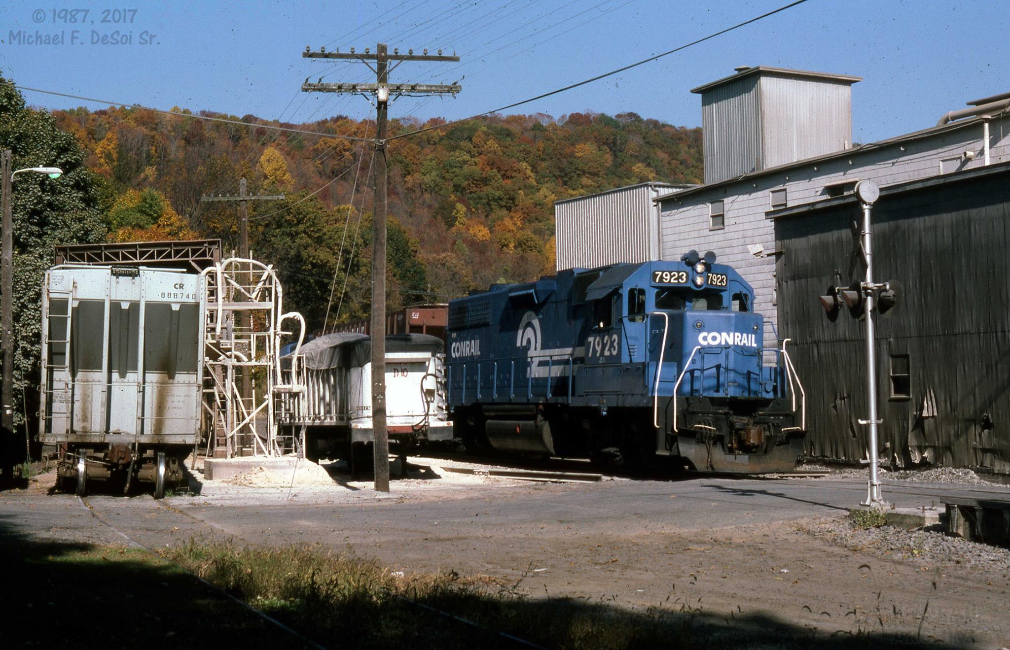 Conrail GP-38 #7923 is shifting the mill in Treichlers, PA. October 1987