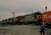 An Enola crew change finds three Southern Pacific U-boats (U33's 8740 and 8791, and U25B 6755) behind a former PC GP-38-2 in May, 1977. Foreign power from ATSF, CNW, D&H and Southern Pacific were all there at Enola on May 7, 1977.