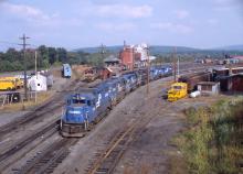 A solid set of ConRail power gets ready to depart East Deerfield West with an empty coal train on Sept. 25, 1982.