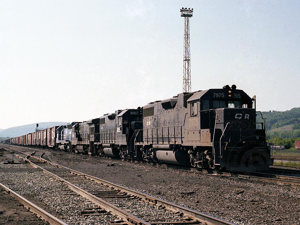 A pair of black GP-38-2s, a U33-B, and a SD-45 in blue wait at Hornell for a recrew.