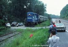 Conrail ended its ownership and operation of the Bloomsburg Branch and the Center County Cluster on July 31, 1984. SEDA-COG Joint Rail Authority became the new owner. Richard Robey, the new operator, renamed the Bloomsburg Branch the North Shore Railroad (NSHR), and the Center County Cluster the Nittany & Bald Eagle Railroad (NBER). Conrail provided an OCS for the dedication ceremony of SEDA-COG Joint Rail Authority and the new operator. The NSHR ceremony was Aug. 14, 1984 and the NBER ceremony was the following day. This photo shows the OCS doing a photo runby at a rural crossing north of Northumberland for the media. Other interested folks benefited as well! CR 7977 (PC 7977) was the OCS locomotive for these ceremonies. CR OCS cars were #10, #12, #26, & #11. See ex-CR 7977 serving in another OCS service in Roger Durfee's photo https://conrailphotos.thecrhs.org/photos/iais-709-gp38-2-ex-cr-7977-oakmont-07-10 .