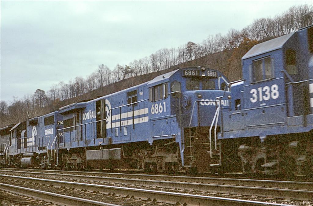 Former PC SD-45 6124 leads CR blue GP38-2 7978, U33C 6861(ex-PC 6556), and GP-40 3138 with a string of piggybacks through Spruce Creek in November, 1980.