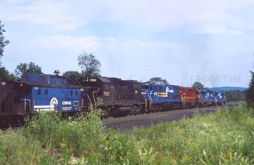 N5C cabin car 23007 tucked in behind the power is a sure indication this is SENH. Also a good look at that U23-C as the train tops the grade in Hinsdale center, MA. on July 18, 1981.