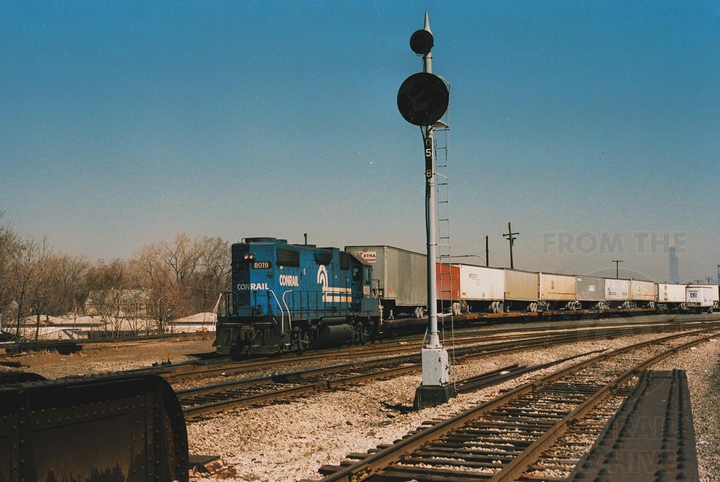 Conrail GP38-2 No 8019 switches piggyback cars at the south end of the 51st Street Yard in April 1987. A C&WI CPL signal guards the main. Doug Davidson photo with permission