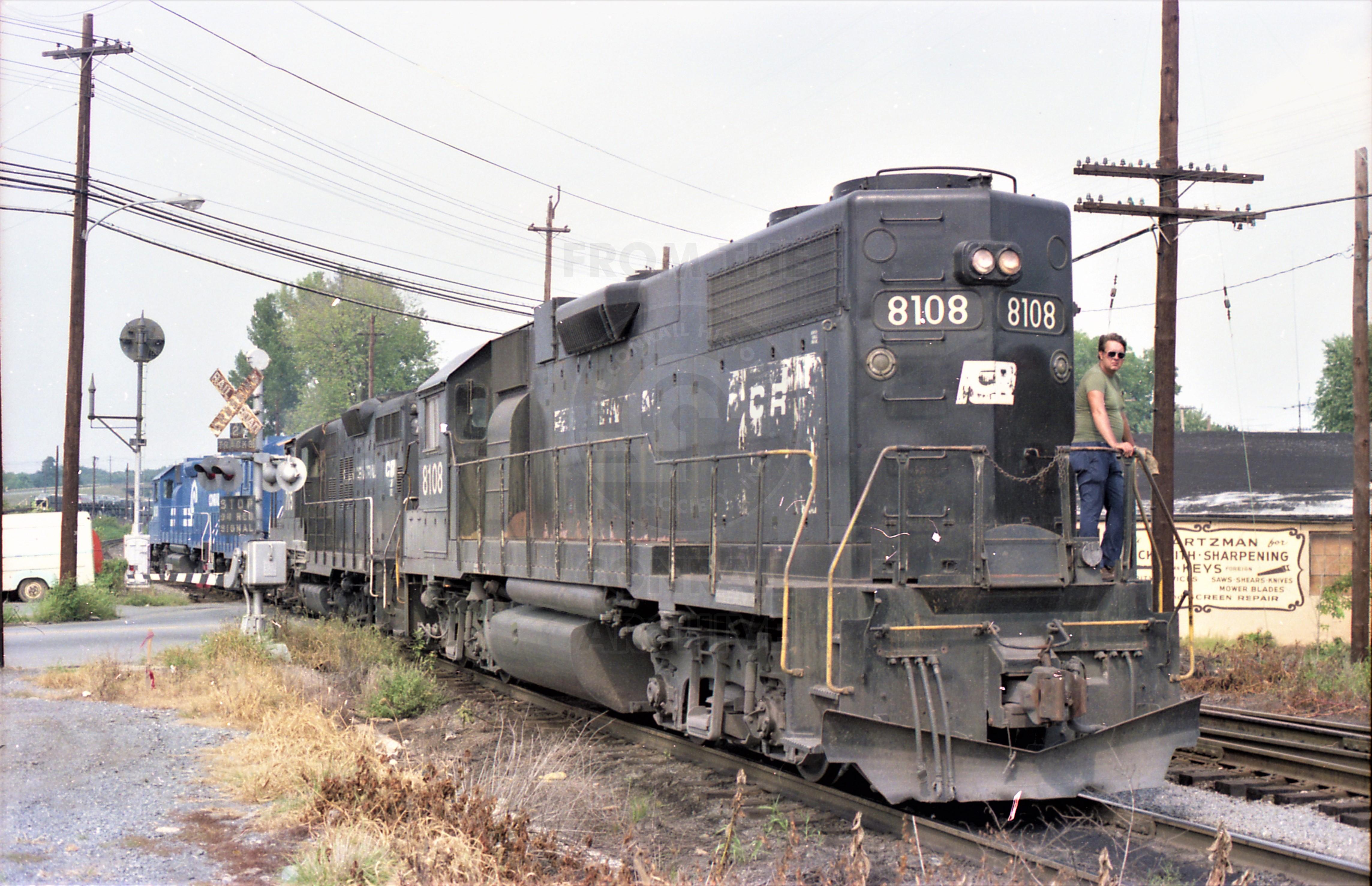 Conrail. GP38-2 #8108, GP-10 #7173, GP38-2 #8131 on ex PRR-PC trackage at Hagerstown, MD. September 16, 1979. The GP-10 is a model designation given by the IC shops during rebuild for Conrail. They were made by either VMV or Homewood Shops. The dynamic brake blister has been welded over and it now is just a high hood with upgraded internals. I want to acknowledge my appreciate to Zach J. Bloomquist for his assistance with the info regarding the GP-10.