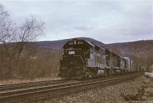 Former PC GP-38-2 8110 leads a trio of units with mixed freight through Spruce Creek, PA in November, 1980.