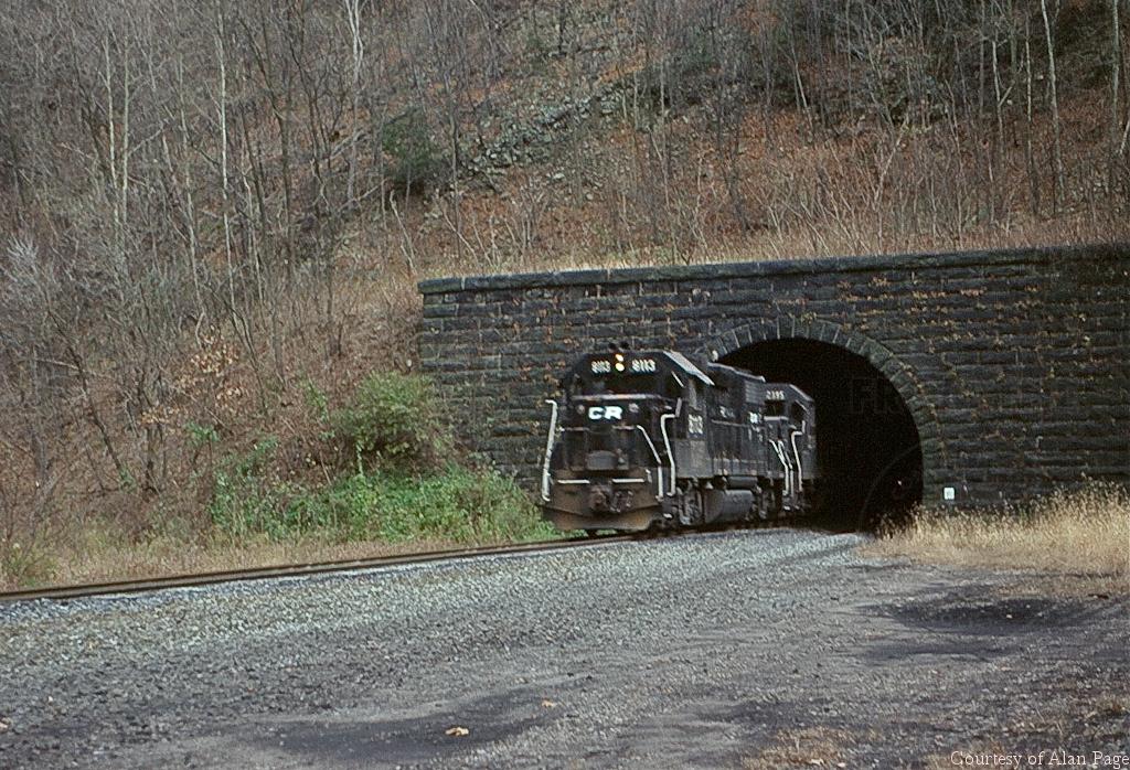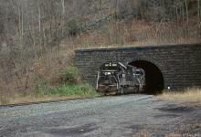 Former PC GP-38-2 8113 leads GP-35 2395 out of the tunnel at Spruce Creek, PA in November, 1980.