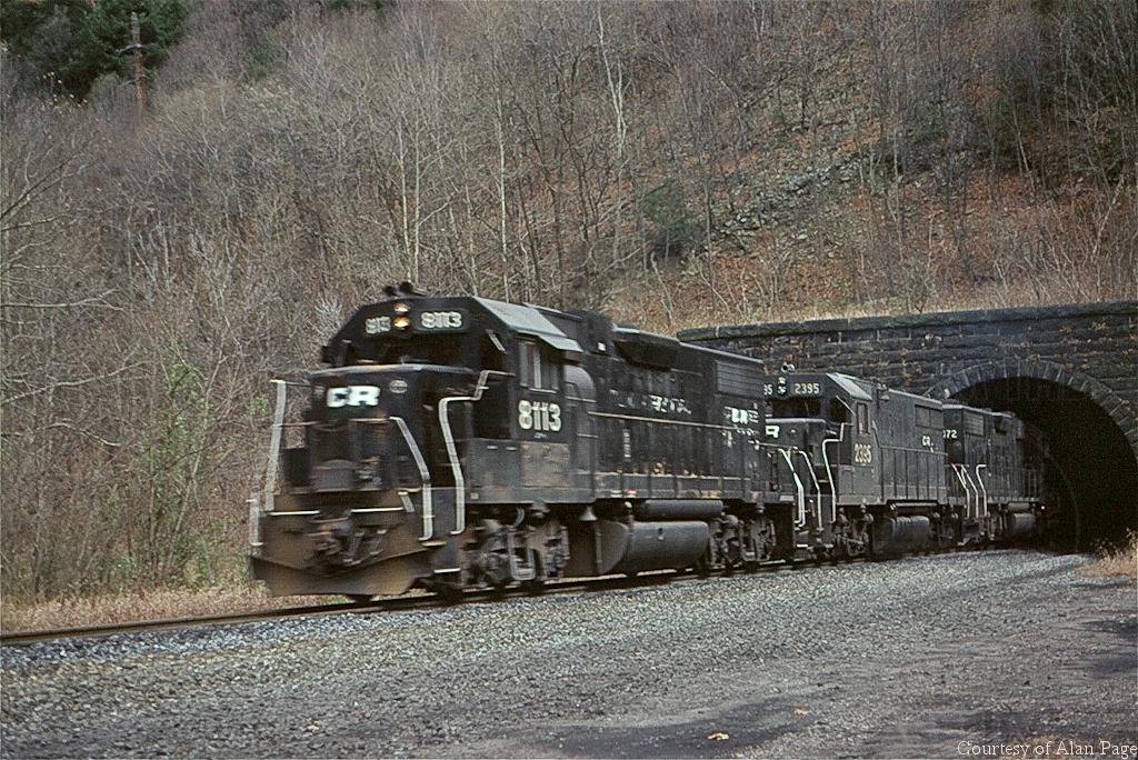 Former PC GP-38-2 8113 blasts out of the tunnel leading GP-35 2395 and another GP-38-2 at Spruce Creek, PA in November, 1980.