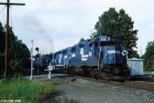 A GP38-2 brings Allentown-Enola manifest ALEN westbound through CP-BURN on September 7, 1990. Notice that this was clearly before the Basin St. grade crossing elimination project took place. Today, the roadbed is on a fill several feet above ground level here.
