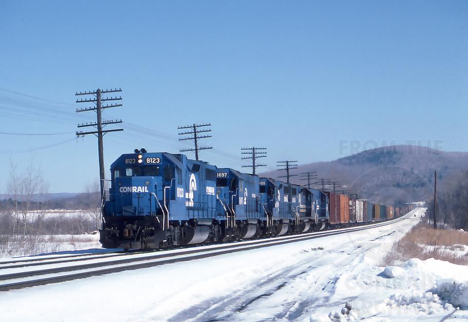 GP38-2 8123 leads MBSE down off the west slope of Washington hill and into North Adams Jct. in Pittsfield, MA. on Feb. 22, 1986.