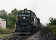 A welded rail train heads up the connector from Sayre to the Southern Tier at Waverly.