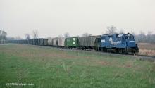 Conrail WB-1 local returns to Newberry Yard from Berwick with a long string of new Chessie System boxcars built at Berwick Forge and Fabricating on the tail end.