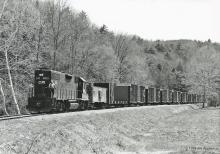 WB-1 local from Berwick to Newberry Yard heads west approaching PA Rt. 42. The crew member on the platform of CR 8150 will flag the crossing. The consist included CR 24530 N12 caboose, later to become the Conrail Police Caboose, an empty bulkhead flat car, and new Chessie Systen boxcars built at BFF. Not much time left for service on the line from M.P. 14 to Berwick.