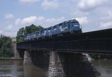A set of GP-38-2s cross the Chenango River after delivering a coal train.