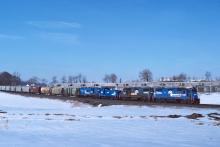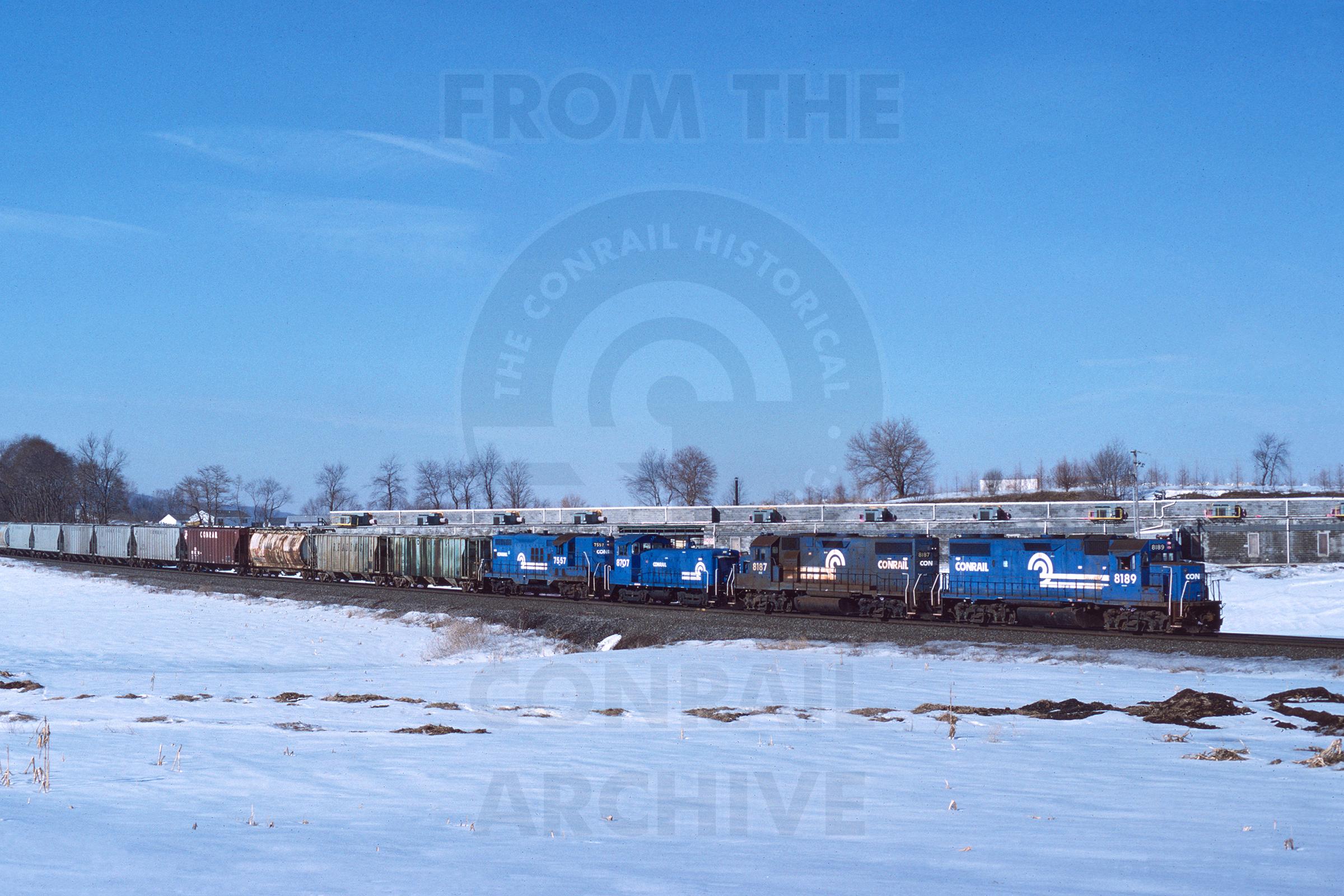 An assortment of EMD four-axle power brings Conrail PGAL1X by the mushroom farms at "Hell Gate", just west of Blandon, PA. This is on the section of single-track Blandon Low Grade between West Laurel and Blandon.
