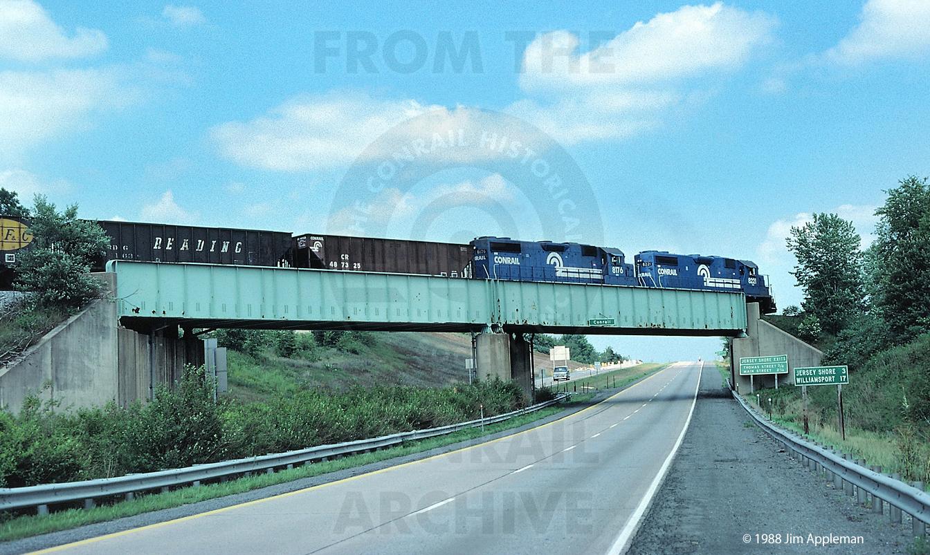 CR 8221 & 8176 with an southbound empty hopper train cross the US Rt. 220 railroad overpass. The last thru trains on the Corning Secondary ran on Oct.7, 1988.
