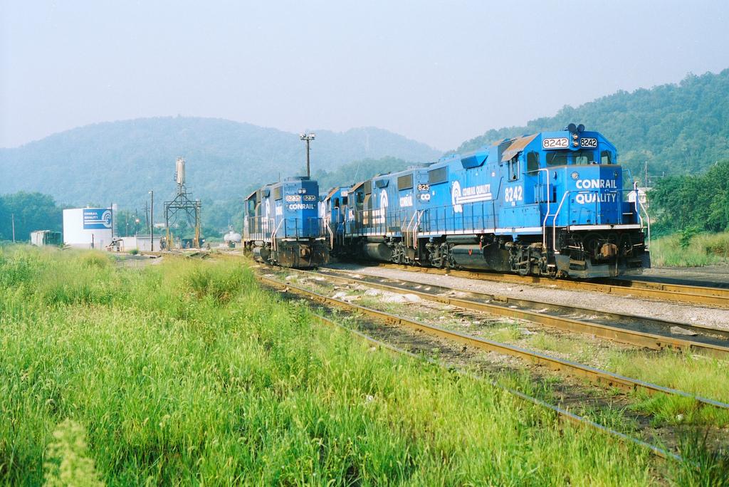 Conrail GP38-2's 8242, 8234, 8250, and others sit in the locomotive terminal at Mingo Jct., OH, in August 1995. Doug Davidson photo with permission