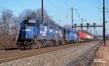 GP38-2s 8248, 8238, 8038 & GP38-7829 are leading a S/B freight at MP 69.6 on Amtrak's Northeast Corridor. 10:46AM on 12-29-84 in Perryman, MD.