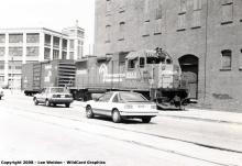 This building has now become a shopping center, but in this photo it was still the American Can company, consuming can stock and shipping out cans for all sorts of uses. Here 8263 is picking up the boxcar from the loading dock.