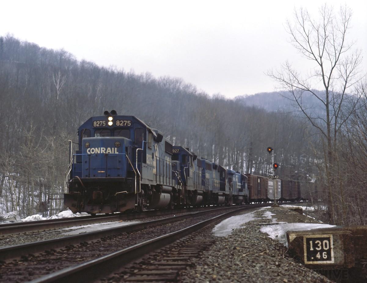 GP38-2 8275 leading RESE at the arch spanning Factory Brook and Town Hill Rd. in Bancroft, MA. on March 13, 1982.