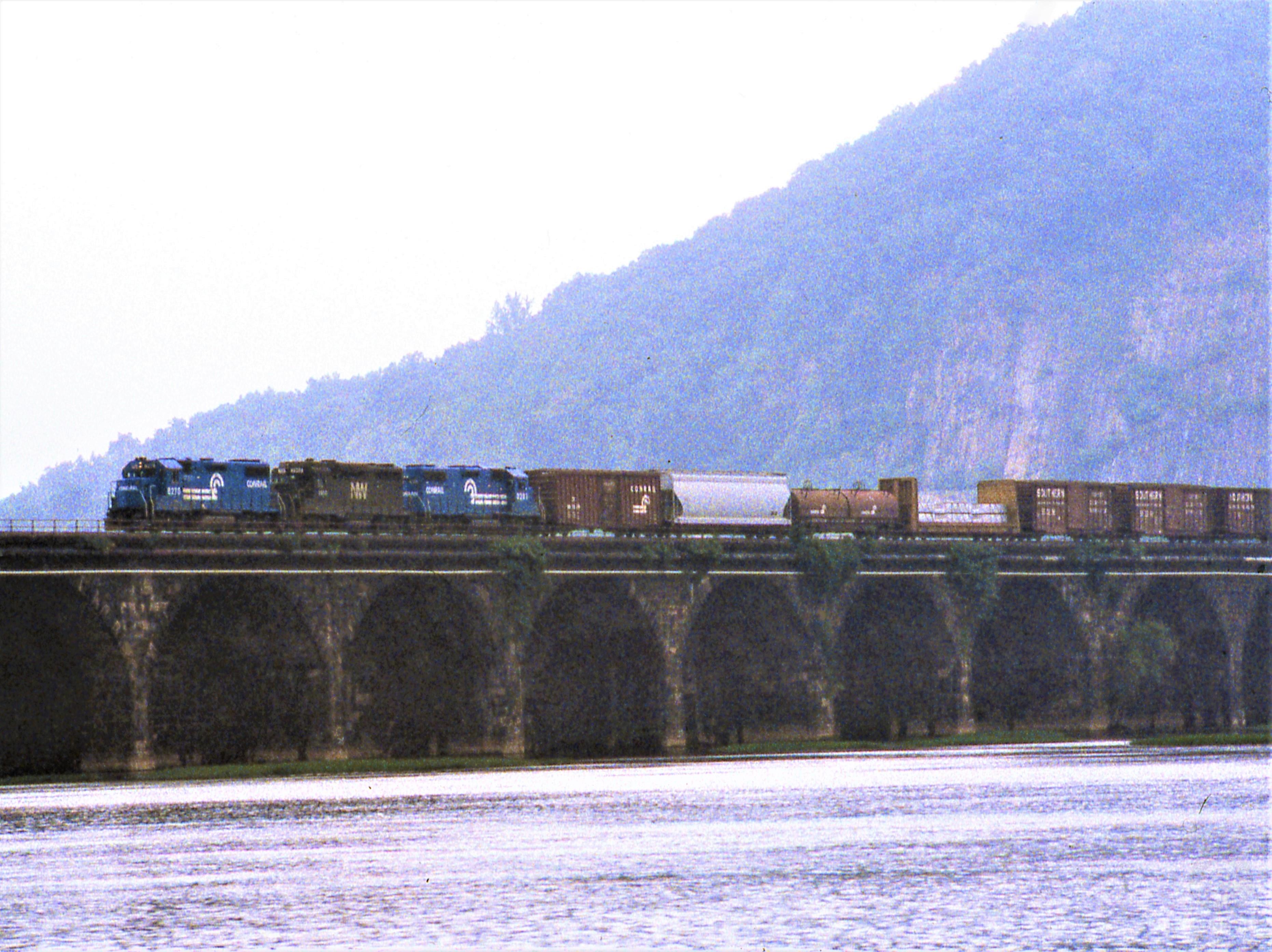 GP38-2 #8278; NW GP-30 #2908 & GP38-2 #8281 with freight on Rockville Bridge on a hazy July 24, 1986