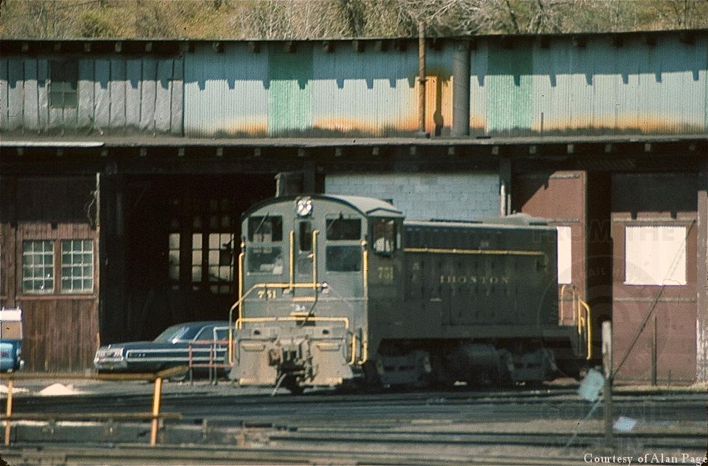 Ironton 751 Baldwin DS4-4-1000 sits at the Bethlehem roundhouse waiting for orders to work the yard. Wonder if the crew for 751 also drove the nice 1964 Chevy Impala!