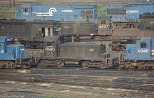 Former PC SW-1's 8590 and 8597 rest in lines of black and blue power at the Enola engine terminal in August, 1979.