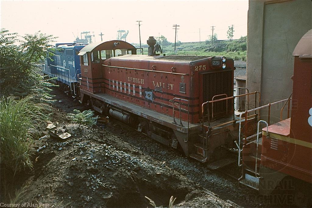 Former LV SW-8 275 (CR 8689) rests with one of the few GP9s with paper air box on the long hood outside the South Amboy diesel facility in July, 1977.