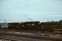 Late in the day at Morrisville yard, RDG SW900 1508 (CR 8708) lines up with PC RS11's 7623 and 7618 in April, 1977.