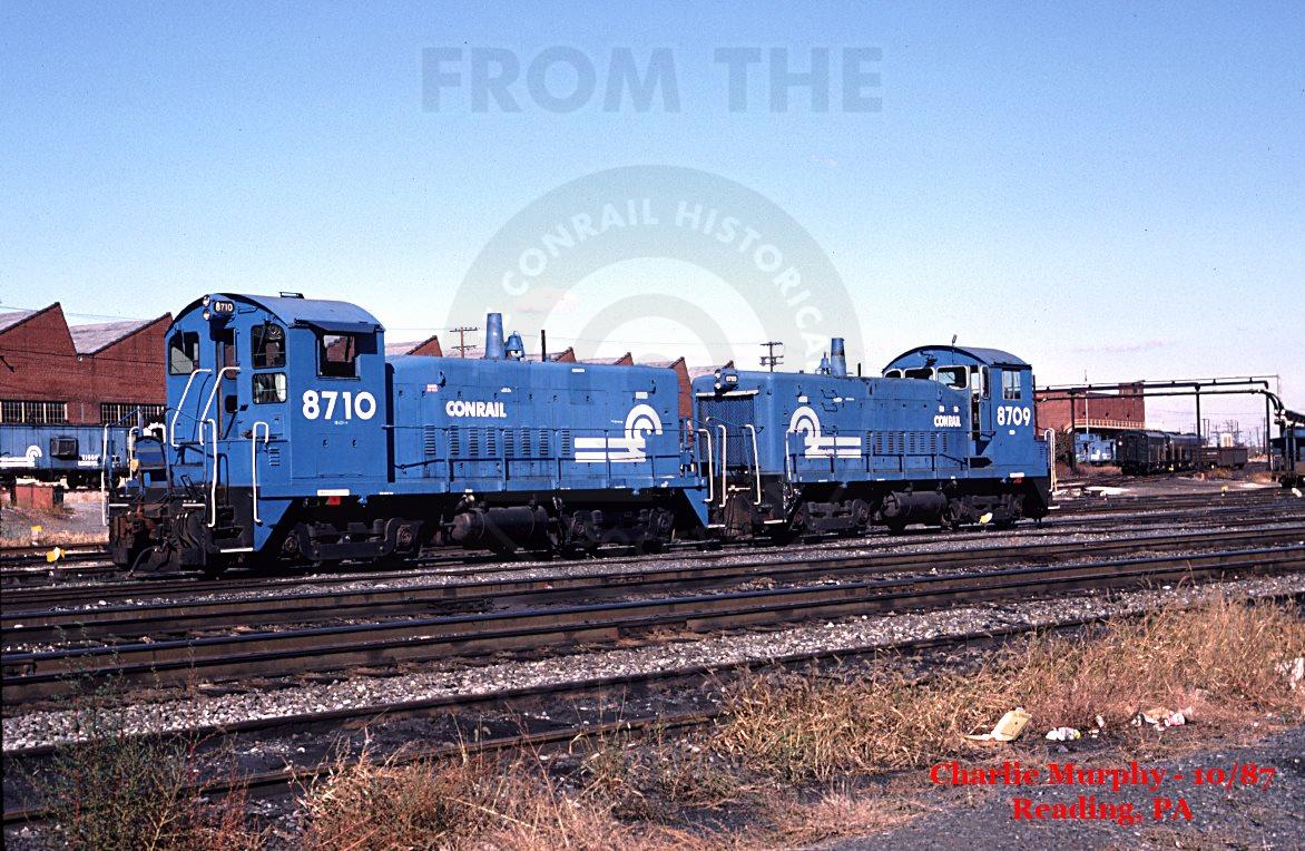 Former Reading SW900m's idle at Spring Street in Reading, PA on a sunny October 1987 morning. These are not the only consecutively numbered locomotives in this shot. If you look carefully on the right, you'll see all three Conrail E8's, 4020, 4021 & 4022 have just arrived and are heading to the passenger car shop. This was the only time I ever saw the rear headlight of one of the E's on; in this case 4022.