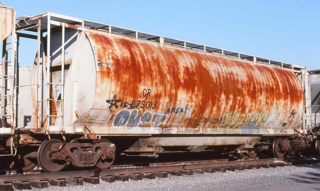 Previous Next Photo By Jeff Weaver Car is ex CNJ 1097 and was built 4-67, would later go to CSX. Year 1997 Original Date 9/27/97 Equipment Type Class CC12A Conrail Number 875013 Collection CRHS Conrail Photo Archive Contributions