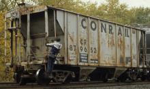 Conrail 879652 is seen at Columbia, PA in the late 1980s. Car is ex PRR 257663. Check out the radios those guys had to lug around back then!
