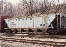 CR 884596 class H32 covered hopper in Pitcairn Yard at North Versailles, PA on 03-29-1986. The car was painted by Conrail's Reading Car Shop in October of 1979. The scale code utilized is "1514". This scale code was used by the Reading Shop for a couple of months at the end of 1979 (roughly from 10-79 to 12-79). Prior to that, they used "RDG" and starting in 01-1980, they used "CR DL".