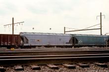 CR class H45 covered hopper 888133 (ex-PRR) is coupled to another class H45 covered hopper, PRR 260806 at Morrisville yard in March, 1981.