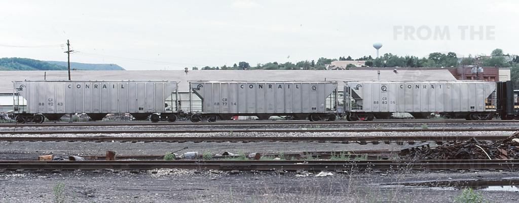 A trio of CR covered hopper that include three different classes, CR 889243 H54, CR 887714 H51C & CR 888305 138H, are seen at Altoona, PA on 6/7/97.